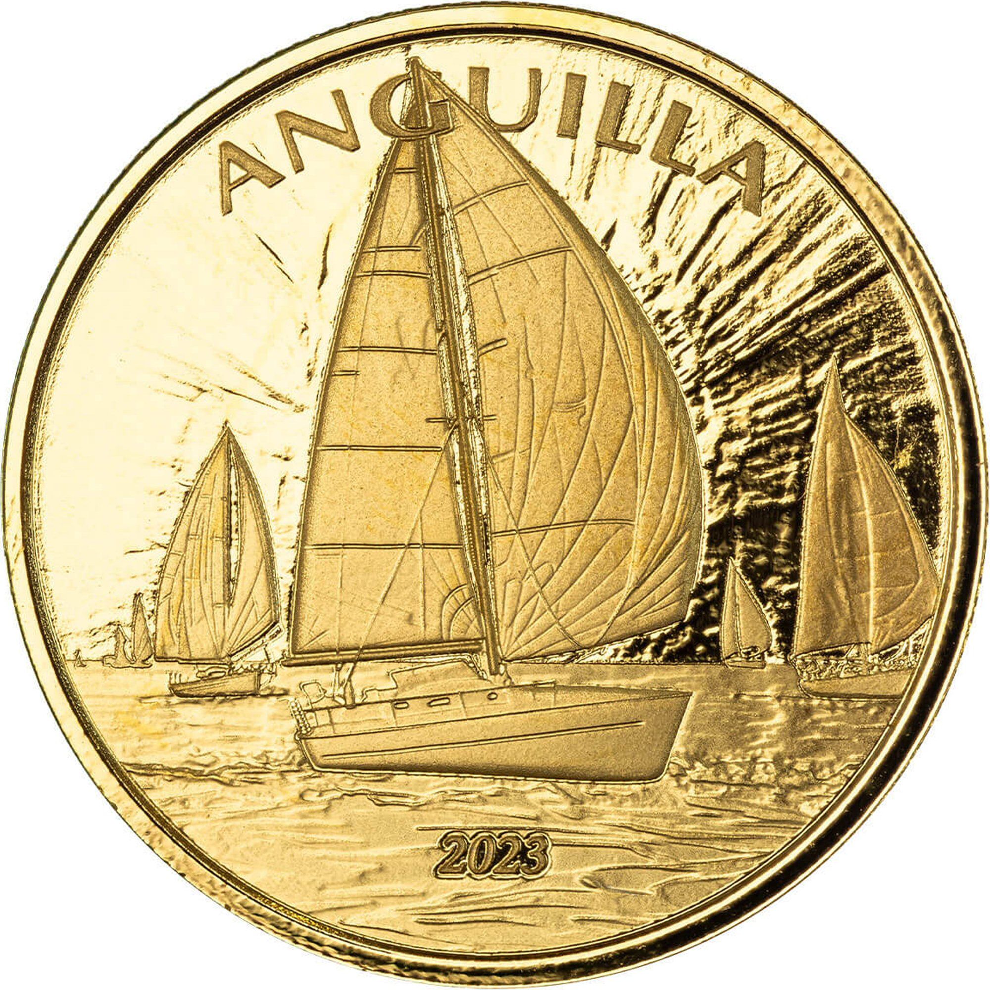 The 10 Dollars coin from Anguilla, issued in 2023, is a stunning piece made of .9999 gold, weighing 31.103 grams. Its design features a prominent emblem of the Eastern Caribbean Central Bank, surrounded by laurel leaves, symbolizing victory and achievement. This coin commemorates the Anguilla Regatta, celebrating the island's rich maritime heritage and cultural significance. The use of high-purity gold not only enhances its aesthetic appeal but also contributes to its intrinsic value, making it a desirable item for collectors. Given its limited mintage and unique thematic representation, this coin holds considerable importance in numismatic circles, appealing to both investors and history enthusiasts alike.