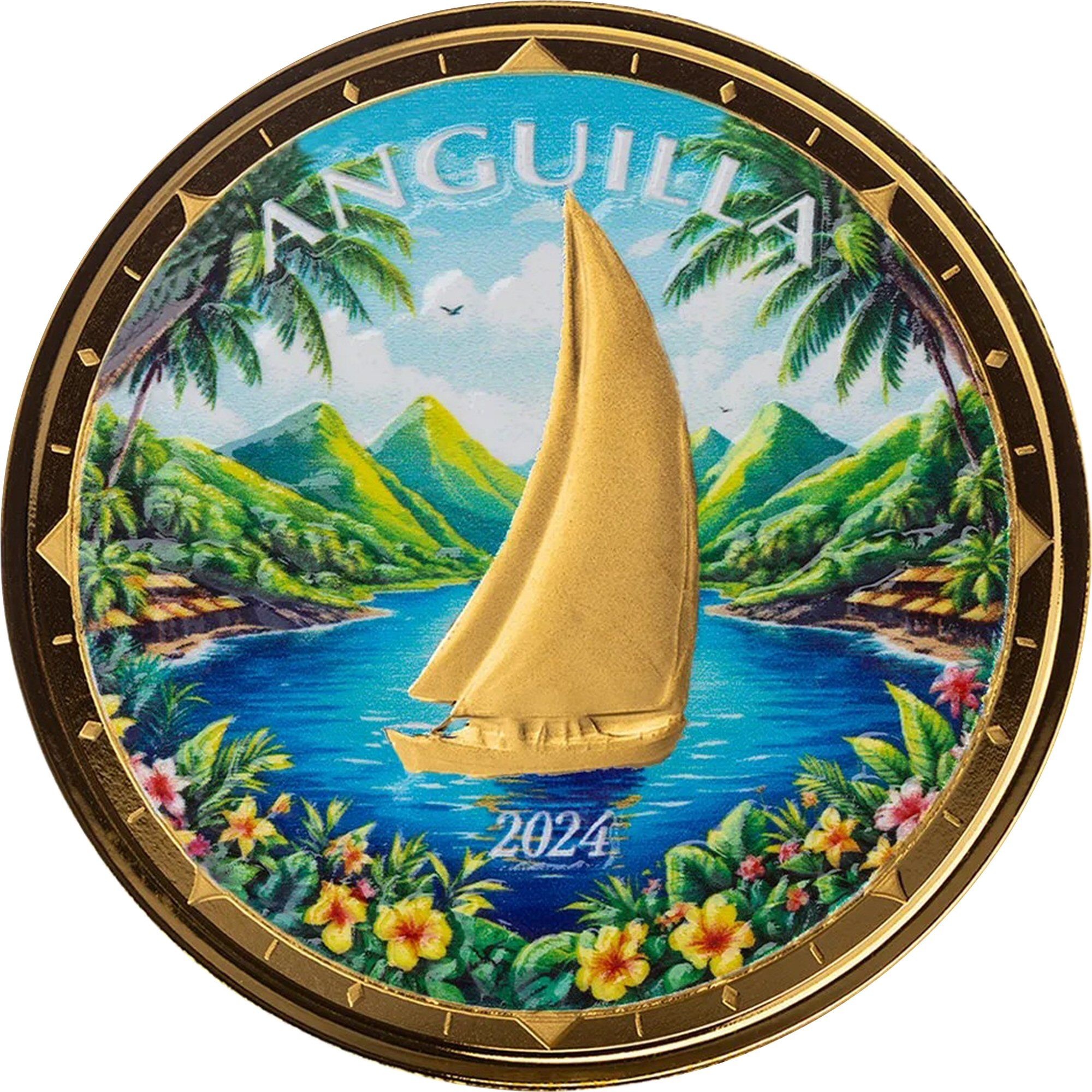 The 10 Dollars coin from Anguilla, issued in 2024, features a stunning design that celebrates the cultural significance of the Regatta, a traditional sailing event. The obverse showcases intricate details, including the emblem of the Eastern Caribbean Central Bank, surrounded by laurel branches symbolizing victory and achievement. Crafted from .9999 fine gold, this coin weighs 31.103 grams, making it not only a beautiful piece of art but also a valuable investment due to its high metal content. The limited mintage and unique design elements contribute to its appeal among collectors, enhancing its historical significance and desirability in the numismatic market.