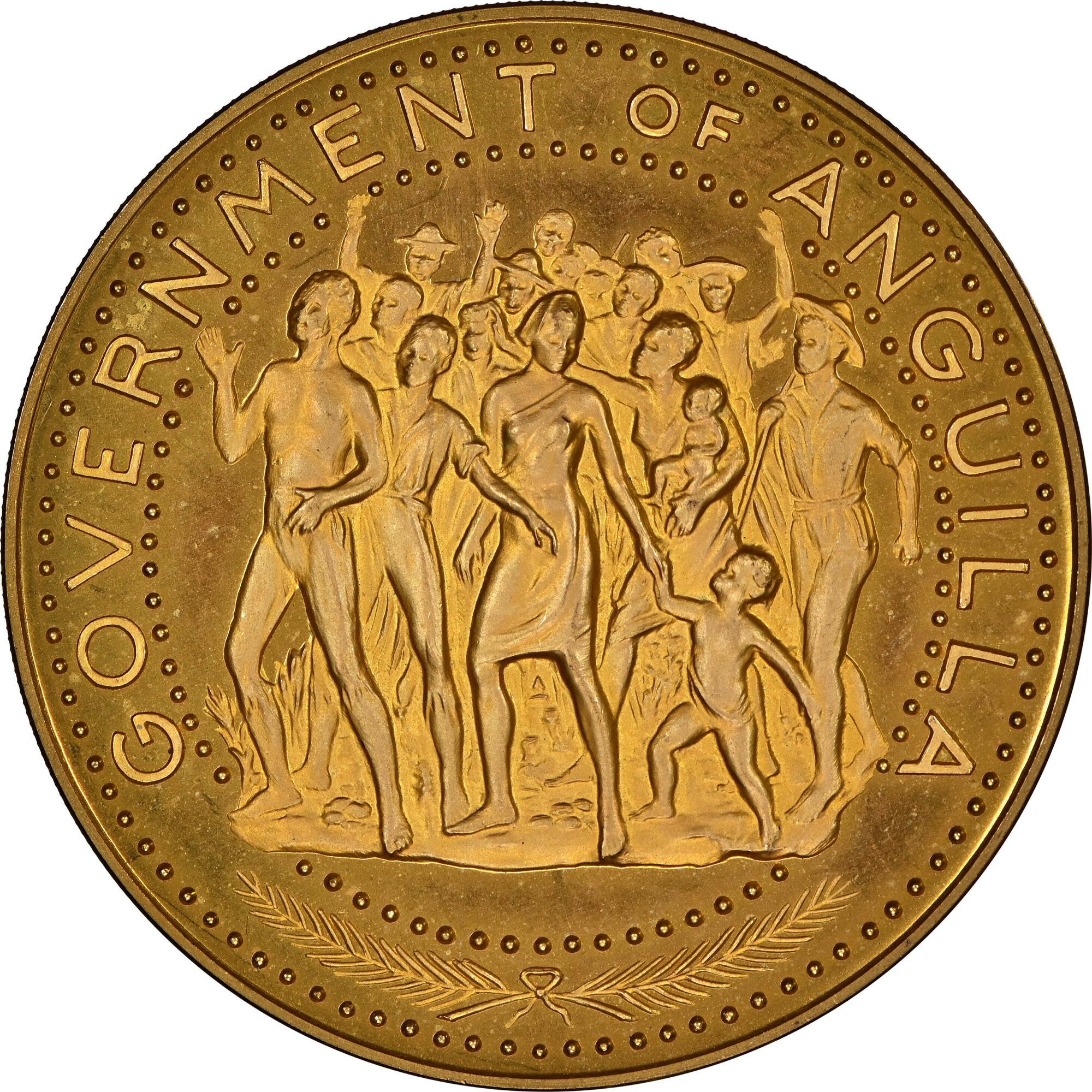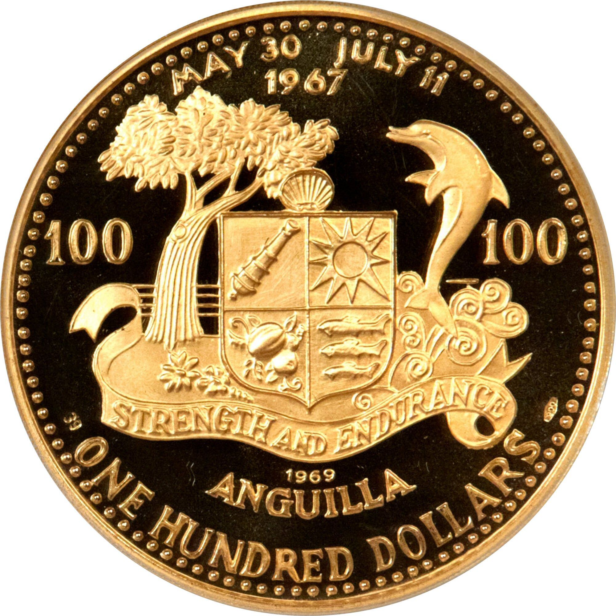 The 100 Dollars coin from Anguilla, issued between 1969 and 1970, features a striking design that captures the spirit of demonstrations, reflecting the island's cultural and historical context. The obverse showcases a group of figures engaged in a demonstration, symbolizing unity and resilience. The coin is composed of .900 gold, weighing 49.37g, which adds significant intrinsic value due to the precious metal content. This combination of historical significance and precious metal composition makes it highly sought after by collectors. The coin's design elements, along with its limited mintage, contribute to its appeal in the numismatic community, marking it as a noteworthy piece of Anguilla's numismatic heritage.