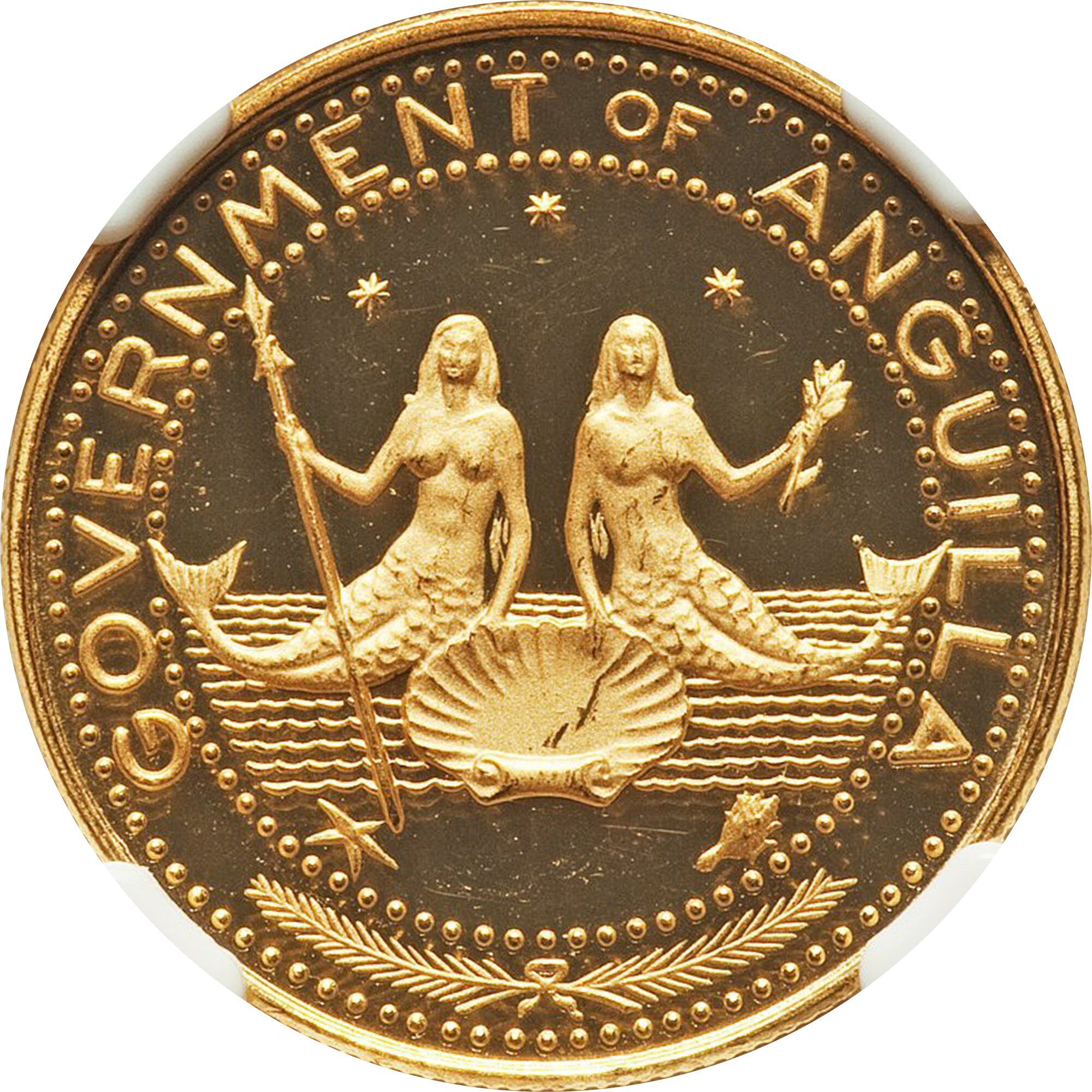 The 20 Dollars coin from Anguilla, issued between 1969 and 1970, features a captivating design that showcases two mermaids, symbolizing beauty and the allure of the sea, set against a backdrop of waves and a shell. This obverse trial coin is notable for its gilding metal plated brass composition, which gives it a striking golden appearance. The coin's design reflects both artistic creativity and cultural significance, making it a sought-after piece among collectors. Its unique theme of mermaids adds to its charm, while the limited issuance enhances its rarity. Though not composed of precious metals, the coin's numismatic value is elevated by its design and historical context, appealing to enthusiasts of both numismatics and maritime folklore.