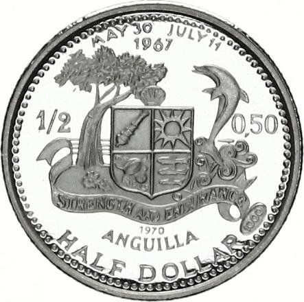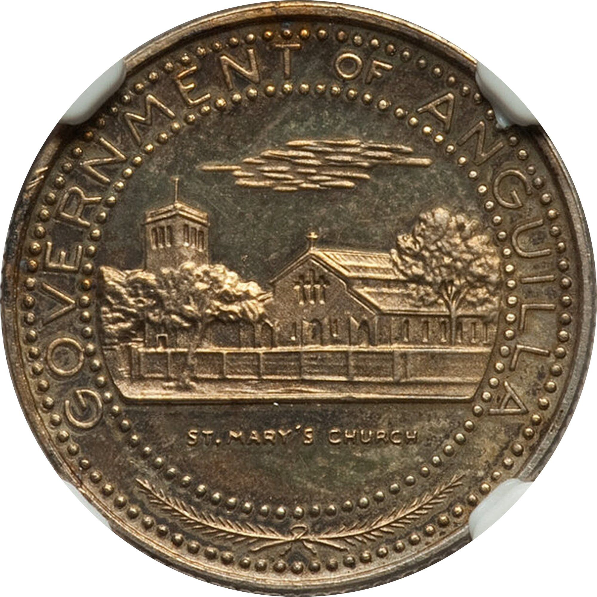 The ½ Dollar coin commemorating Saint Mary's Church, issued by Anguilla between 1969 and 1970, features a detailed depiction of the church, showcasing its architectural beauty and cultural significance to the island. The design includes the inscription 'GOVERNMENT OF ANGUILLA' and the church's name, 'ST. MARY'S CHURCH,' surrounded by a beaded border. Made of .9999 silver, this coin not only holds numismatic value but also intrinsic value due to its precious metal content. Collectors appreciate this coin for its historical context and limited mintage, making it a sought-after piece for numismatists. Its design reflects the rich heritage of Anguilla, contributing to its importance in both local and international collections.