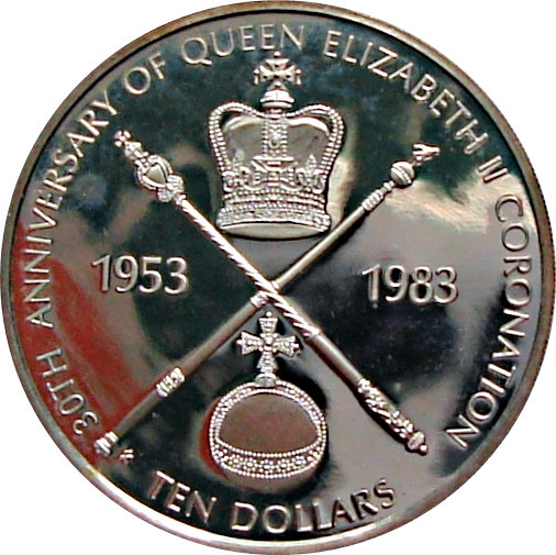 The 10 Dollars coin issued by the British Virgin Islands in 1983 commemorates the 30th Anniversary of Queen Elizabeth II's coronation. The obverse features a detailed profile of the Queen, adorned with a crown, symbolizing her royal status and the significance of the occasion. The reverse likely includes elements reflecting the anniversary theme, although specific details are not visible in the image. Composed of 50% silver, this coin not only holds historical value but also appeals to collectors due to its precious metal content, which enhances its market value. Its limited mintage adds to its desirability among numismatists, making it a noteworthy piece for both collectors and investors alike.