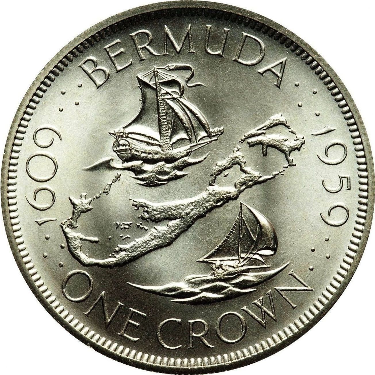 The 1 Crown coin issued by Bermuda in 1959 commemorates the 350th anniversary of the colony's founding. The obverse features a striking portrait of Queen Elizabeth II, adorned with a crown, symbolizing her reign and the British monarchy. The reverse likely showcases elements reflecting Bermuda's history or culture, although specific details are not visible in the image. Made of 50% silver, this coin weighs 28.28g, contributing to its appeal among collectors due to both its precious metal content and historical significance. Coins from this era are sought after for their aesthetic design and connection to Bermuda's colonial past, making them valuable additions to numismatic collections.