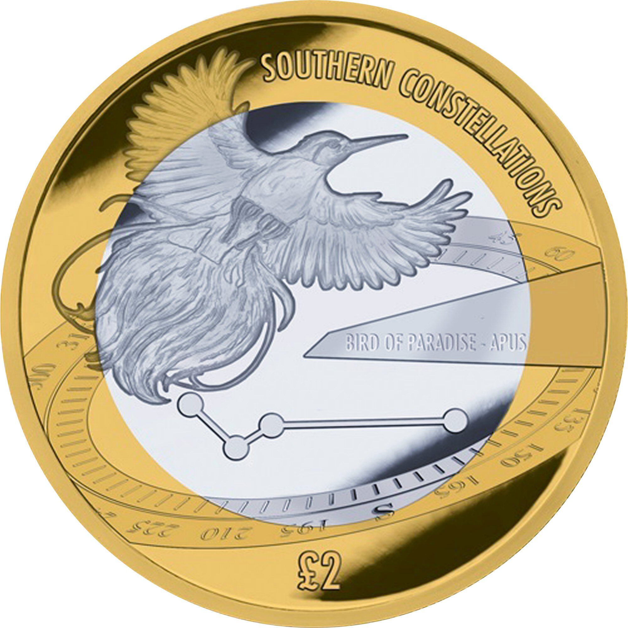 The 2 Pounds coin issued by the British Antarctic Territory in 2022 features a striking design that highlights the Apus constellation and a Bird of Paradise, symbolizing the beauty and diversity of wildlife in the Antarctic region. The coin's outer ring is gold plated, encasing a core of .999 silver, which not only enhances its aesthetic appeal but also contributes to its intrinsic value. This combination of precious metals makes it a desirable piece for collectors. The coin's design pays homage to both the natural world and the legacy of exploration, making it a significant addition to any numismatic collection. Its limited issue further elevates its importance in the market, appealing to both collectors and investors alike.