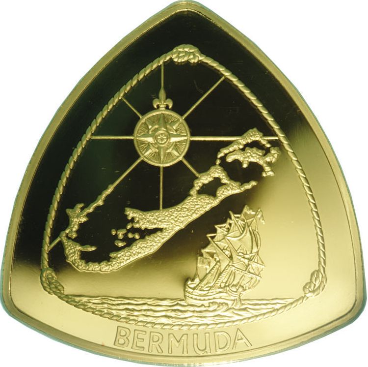 The 180 Dollars coin issued by Bermuda in 1996 is a striking piece made of .999 gold, weighing 155.52g. Its design features a profile of Queen Elizabeth II, adorned with a crown, showcasing the artistry of the engraver. The coin's triangular shape is distinctive, setting it apart from traditional round coins. The inscription '180 DOLLARS' and 'ELIZABETH II' emphasizes its denomination and issuer. This coin commemorates the Bermuda Triangle, adding a layer of historical significance and intrigue. Its gold composition not only enhances its aesthetic appeal but also contributes to its value, making it a sought-after item among collectors. The limited mintage and unique design elements further elevate its desirability in the numismatic market.