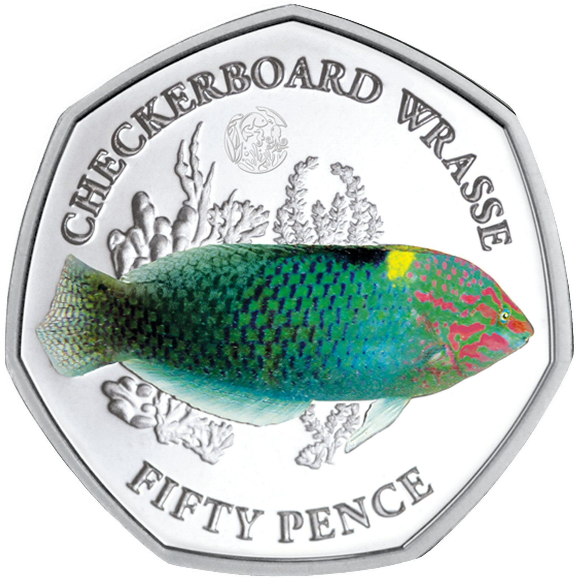 The 50 Pence coin from the British Indian Ocean Territory features a striking design celebrating the Checkerboard wrasse, a vibrant fish native to the region. The obverse showcases a portrait of Queen Elizabeth II, designed by Jody Clark, which emphasizes her regal profile and intricate crown details. Struck in .925 silver, this coin not only holds aesthetic appeal but also contains intrinsic value due to its precious metal composition. Released in 2021, it serves as a commemorative piece that reflects the unique biodiversity of the territory, making it a significant addition to any collection. Its limited mintage and thematic relevance enhance its desirability among collectors, particularly those focused on wildlife and marine life themes.
