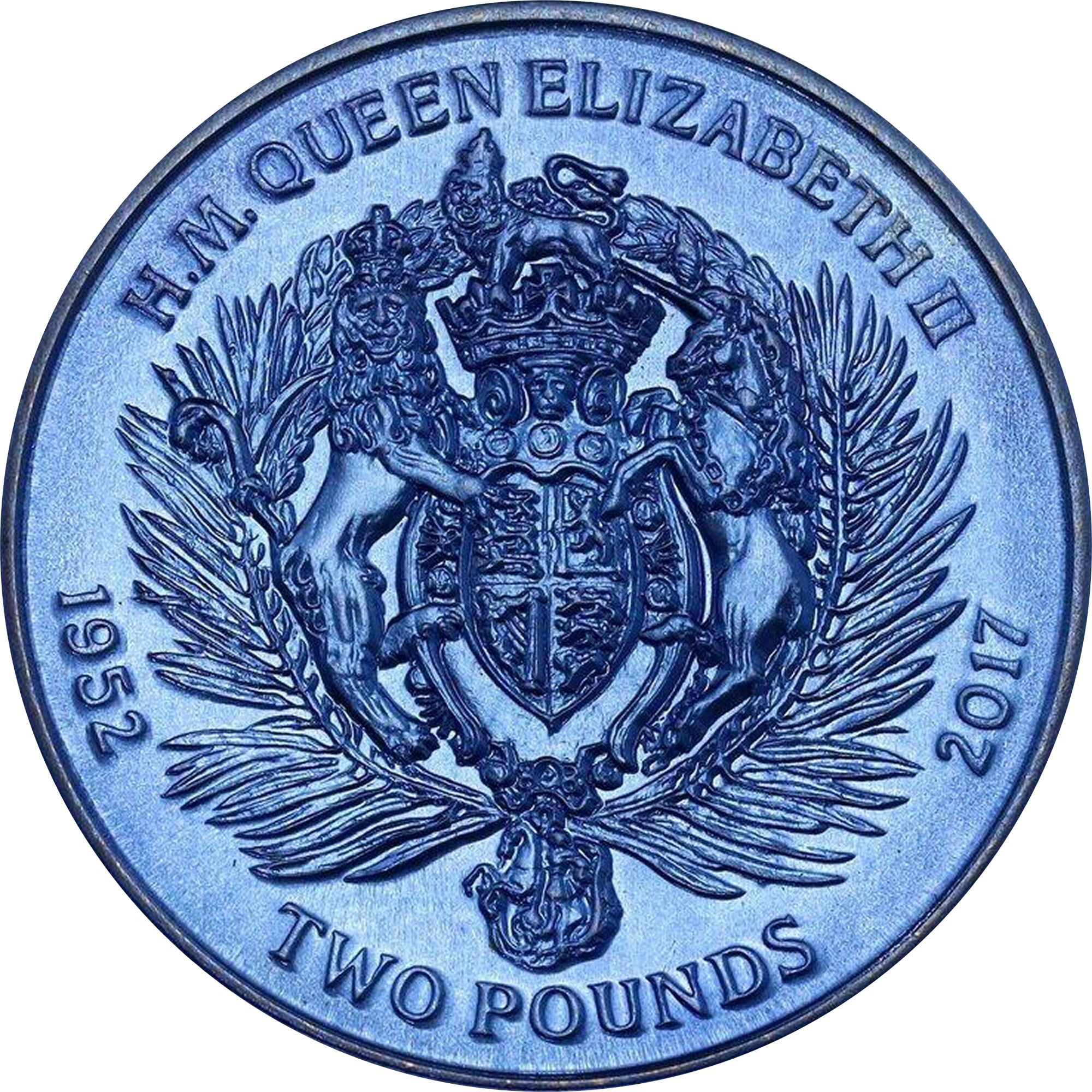The 2 Pounds coin issued by the British Indian Ocean Territory in 2017 features a striking design of Queen Elizabeth II in profile, adorned with a crown and intricate details that reflect her royal status. The coin is composed of titanium, giving it a distinctive blue hue, which sets it apart from traditional precious metal coins. This unique composition not only enhances its aesthetic appeal but also contributes to its lightweight nature, weighing just 10 grams. The coin's historical significance lies in its representation of the British Indian Ocean Territory, making it a noteworthy addition for collectors interested in British territories and modern numismatic art. Its limited mintage in 2017 adds to its desirability among numismatists.