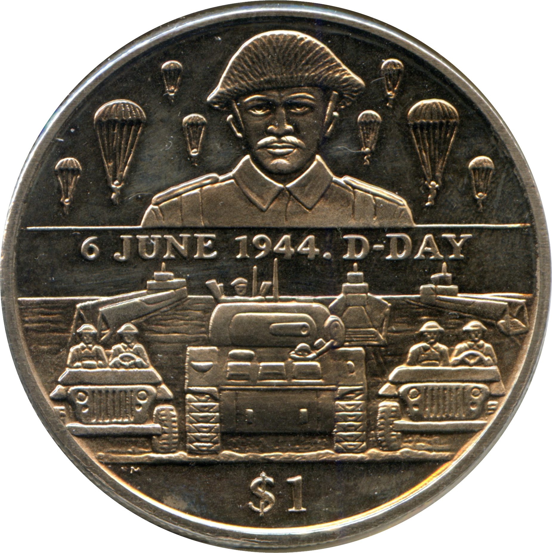 The 2004 $1 coin from the British Virgin Islands features a striking design commemorating D-Day and its soldiers, highlighting the historical significance of this pivotal event in World War II. The obverse showcases a detailed portrait of Queen Elizabeth II, surrounded by the inscription 'BRITISH VIRGIN ISLANDS' and 'QUEEN ELIZABETH II 2004'. The coin is composed of copper-nickel, weighing 28.28g, which gives it a robust feel and durability. While it does not contain precious metals, its commemorative nature and historical context enhance its appeal to collectors. The coin serves as a tribute to the bravery of soldiers during D-Day, making it a meaningful addition to any numismatic collection.