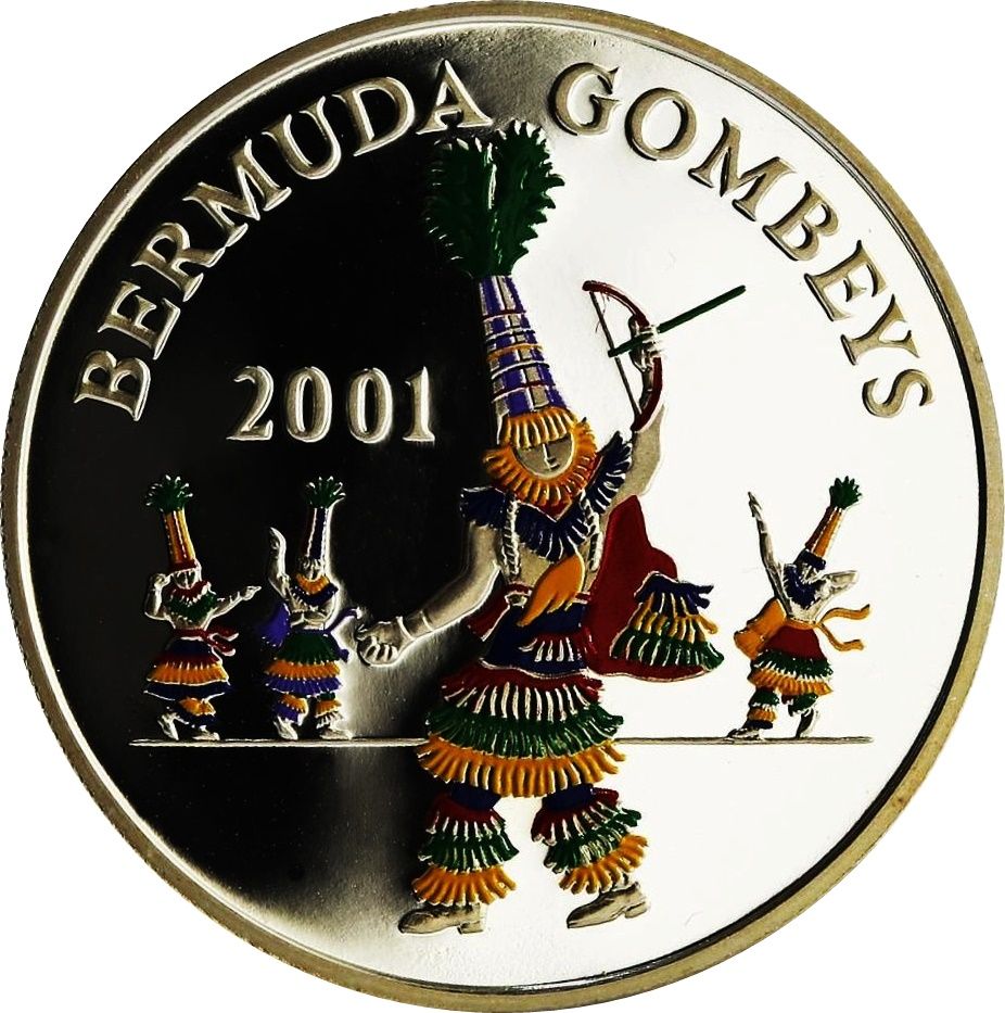 The 2001 Bermuda 5 Dollar coin features a striking design that showcases the profile of Queen Elizabeth II, adorned with a detailed crown, symbolizing her reign and the British monarchy. The reverse side celebrates Bermuda's cultural heritage with an image of Gombey dancers, vibrant figures that represent the island's unique blend of African and British influences. This coin is composed of 92.5% silver, contributing to its intrinsic value and appeal among collectors. The combination of its artistic design and precious metal composition makes it a sought-after piece in numismatic circles, reflecting both historical and cultural significance.