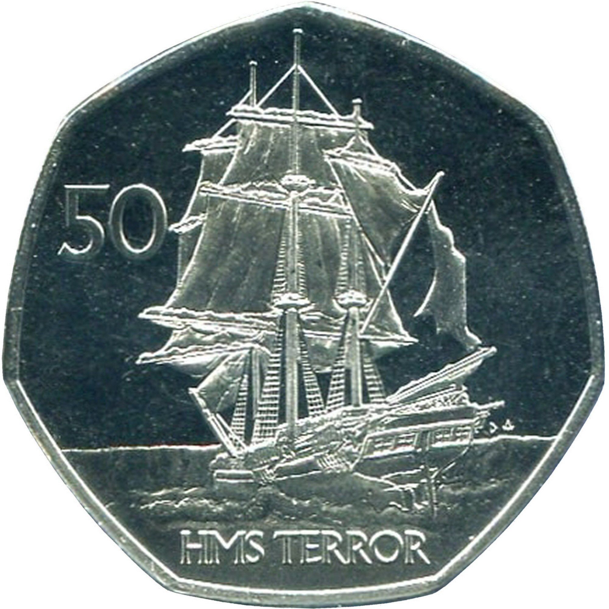 The 50 Pence coin issued by the British Antarctic Territory in 2021 commemorates the HMS Terror, a significant vessel in the history of polar exploration. The obverse features a portrait of Queen Elizabeth II, designed by Jody Clark, showcasing her wearing a tiara and pearls, which adds a regal touch to the coin. The reverse side likely depicts thematic elements related to the HMS Terror, emphasizing its historical importance. Made of copper-nickel with a diamond finish, this coin is not composed of precious metals, which affects its market value. Its unique heptagonal shape and commemorative nature make it a desirable piece for collectors, particularly those interested in maritime history and British numismatics.