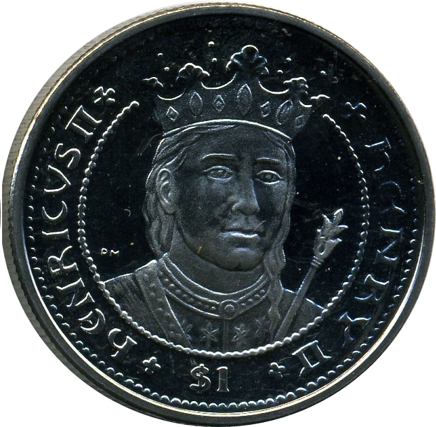 The 1 Dollar coin from the British Virgin Islands, issued in 2007, features a striking portrait of Queen Elizabeth II, showcasing her profile adorned with a regal crown. This coin commemorates the historical significance of King Henry II Plantagenet, linking the modern monarchy to its medieval roots. The reverse side typically features thematic elements reflecting the culture or history of the British Virgin Islands. Made of copper-nickel, the coin weighs 28.28g, providing a substantial feel that appeals to collectors. While it does not contain precious metals, its design and limited mintage enhance its desirability among numismatists, making it a notable addition to any collection.