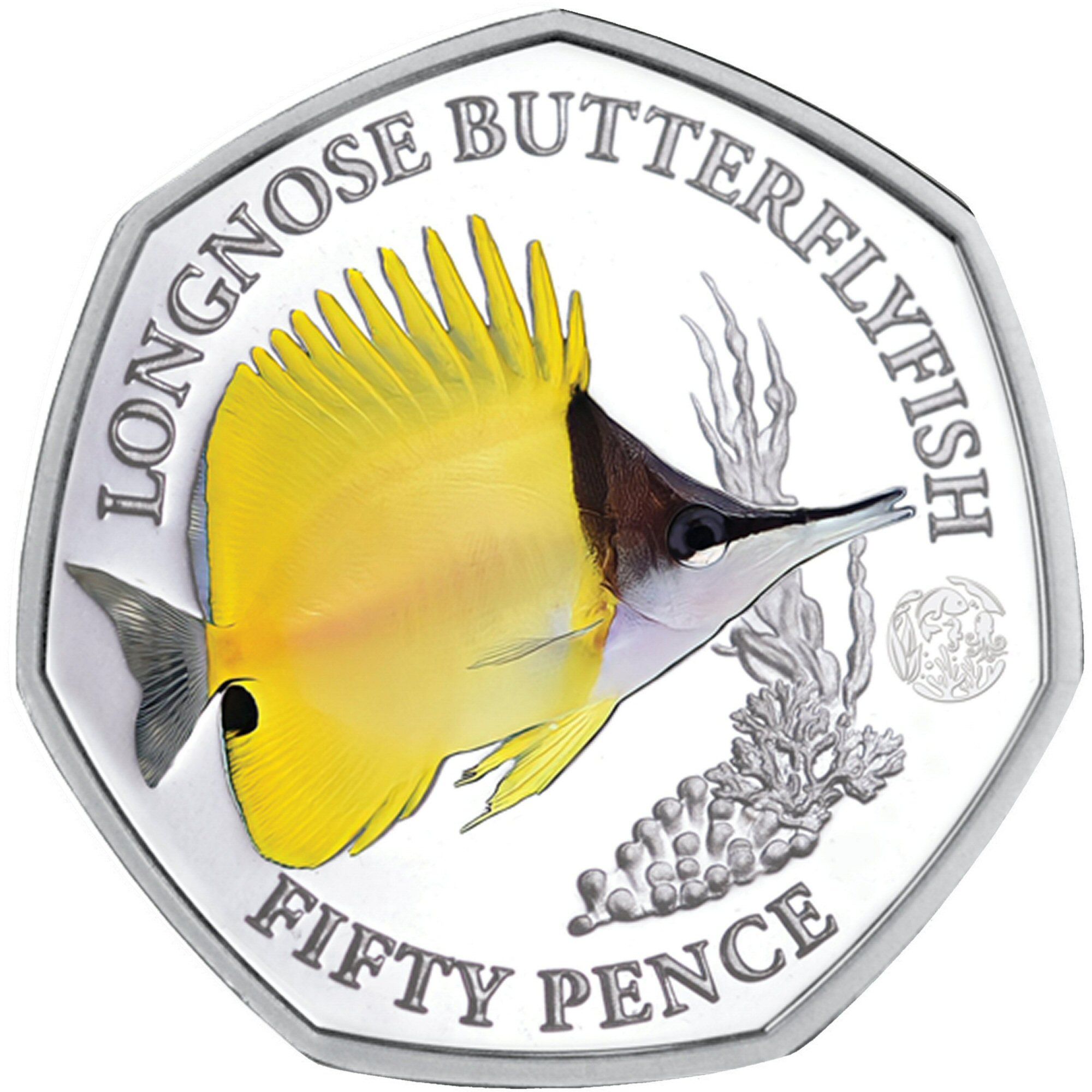 The 50 Pence coin issued by the British Indian Ocean Territory in 2021 features a detailed depiction of Queen Elizabeth II, showcasing her profile adorned with a crown. The reverse side highlights the Longnose butterflyfish, a symbol of the region's rich marine biodiversity. This coin is composed of .925 silver, contributing to its intrinsic value and appeal among collectors. The combination of its artistic design and precious metal content elevates its significance in numismatics, making it a desirable piece for both collectors and investors. The limited year of issue adds to its rarity, enhancing its desirability in the market.