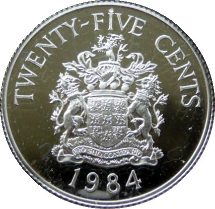 The 25 Cents coin featuring Elizabeth II is a notable piece from Bermuda, minted in 1984. This coin showcases a finely detailed portrait of Queen Elizabeth II, highlighting her profile adorned with a tiara, a design that symbolizes the British monarchy's influence in Bermuda. The reverse side typically features elements representative of Bermuda's culture or wildlife, enhancing its appeal to collectors. Composed of .925 silver, this coin not only holds numismatic value but also intrinsic value due to its precious metal content. The limited mintage in 1984 adds to its desirability, making it a significant item for collectors interested in modern British Commonwealth coins.
