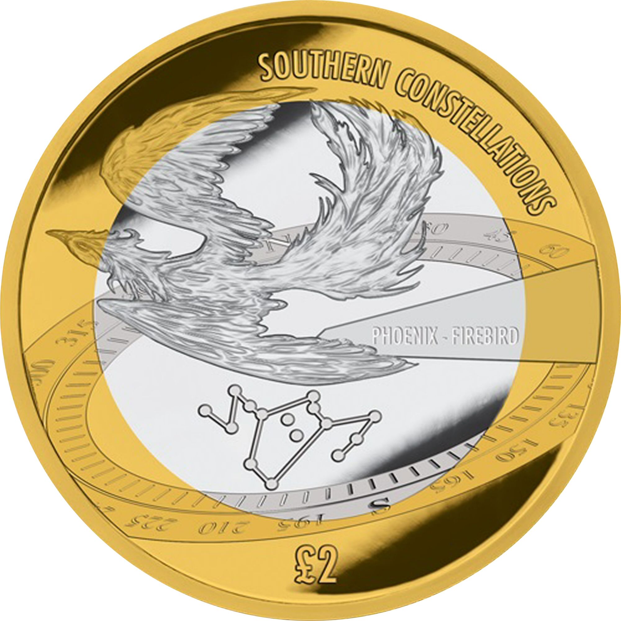 The 2 Pounds coin issued by the British Antarctic Territory in 2022 features a striking design that celebrates the Phoenix constellation, symbolizing rebirth and renewal. The obverse showcases a detailed portrait of Queen Elizabeth II, framed by the inscription 'BRITISH ANTARCTIC TERRITORY' and the year '2022'. The coin's bimetallic composition, with a copper-nickel center set in a nickel-brass ring, adds to its visual appeal and durability. This coin is significant not only for its artistic design but also for its connection to the unique heritage of the British Antarctic Territory. Collectors value it for its limited mintage and thematic representation, making it a noteworthy addition to any collection focused on commemorative issues or royal portraits.