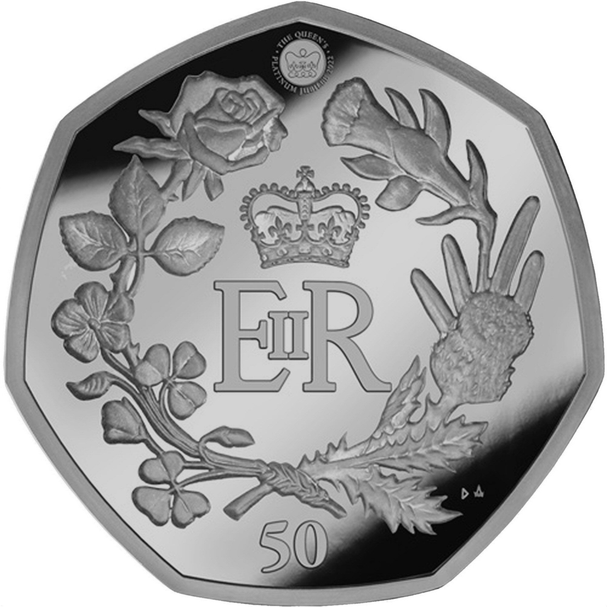 The 50 Pence coin issued by the British Antarctic Territory in 2022 commemorates the Platinum Jubilee of Queen Elizabeth II. The obverse features a detailed profile of the Queen, adorned with a crown and intricate jewelry, symbolizing her long reign and dedication to the Commonwealth. The reverse design, while not visible in the image, typically reflects themes of celebration and heritage. Made from copper-nickel with a diamond finish, this coin showcases a lustrous appearance that enhances its appeal to collectors. As a commemorative piece, it holds historical significance and is sought after for its connection to a major royal milestone, making it a valuable addition to any numismatic collection.
