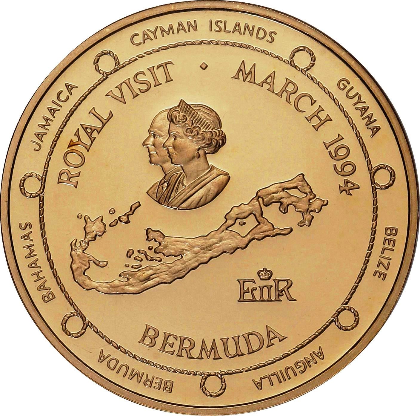 The 100 Dollars coin featuring Elizabeth II commemorates her Royal Visit to Bermuda in 1994. The obverse showcases a finely detailed portrait of Queen Elizabeth II, adorned with a crown, symbolizing her royal heritage. The inscription 'ELIZABETH II' and the denomination 'ONE HUNDRED DOLLARS' along with the year '1994' highlight its significance. This coin is composed of .917 gold, weighing 47.54g, which not only enhances its aesthetic appeal but also contributes to its intrinsic value due to the precious metal content. As a limited issue, it holds historical importance and is sought after by collectors, making it a valuable addition to any numismatic collection.