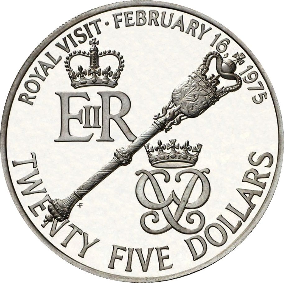 This 25 Dollar coin from Bermuda, issued in 1975, features a striking portrait of Queen Elizabeth II, showcasing her profile adorned with a regal crown. The coin is part of a silver proof issue, composed of .925 silver, which not only enhances its aesthetic appeal but also contributes significantly to its market value due to the precious metal content. The year of issue marks a notable royal visit, adding historical significance and making it a sought-after piece among collectors. The detailed engraving highlights the craftsmanship typical of proof coins, while the limited mintage enhances its desirability. Collectors value this coin not only for its silver content but also for its commemorative nature and connection to British royalty.