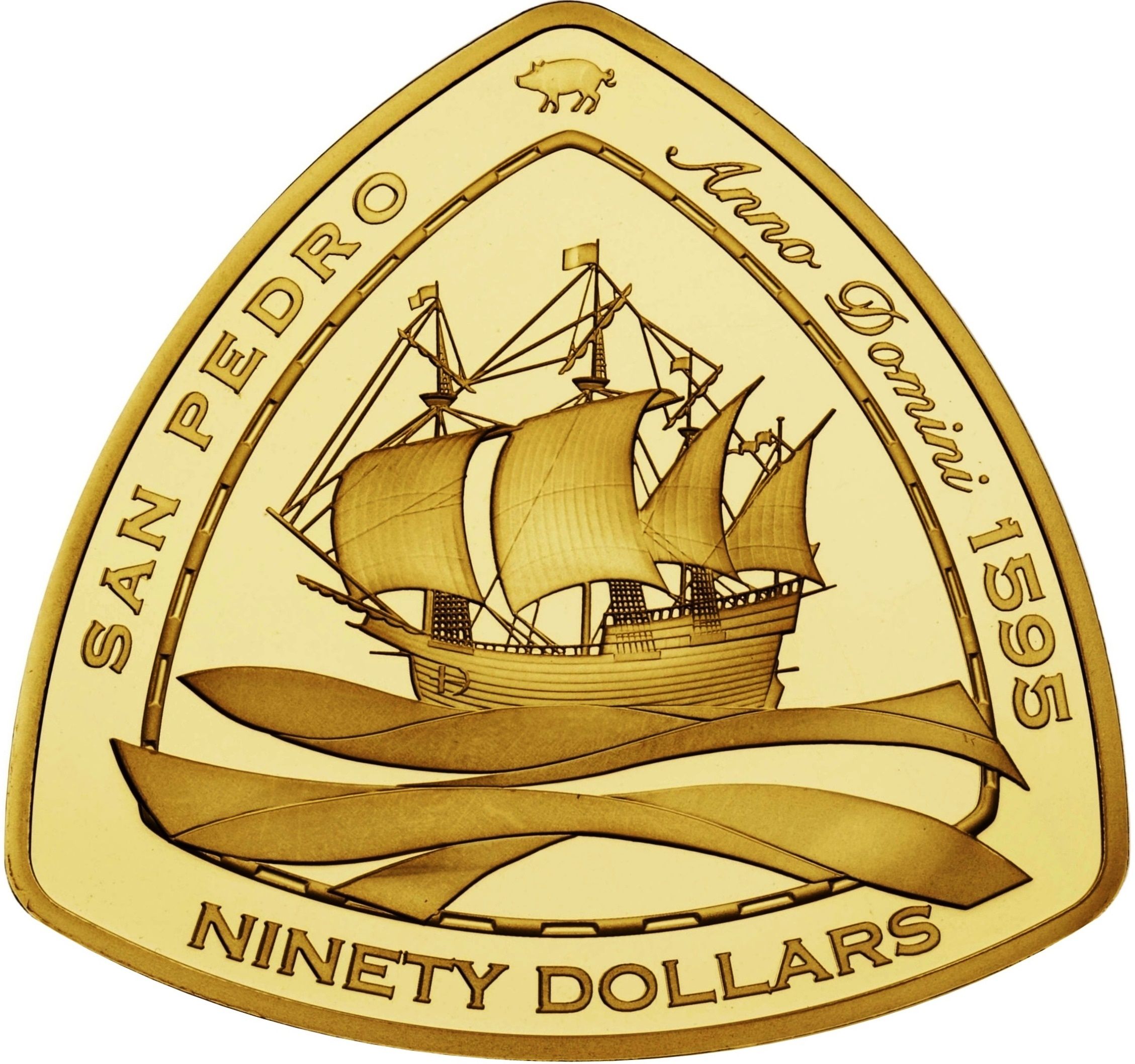 The 90 Dollars coin from Bermuda, issued in 2007, features a striking design that showcases a profile of Queen Elizabeth II, surrounded by the inscriptions 'BERMUDA' and 'ELIZABETH II.' The coin's triangular shape and gold composition, with a purity of .999, contribute to its aesthetic appeal and intrinsic value. Weighing 155.52 grams, this coin is not only a legal tender but also a significant collectible piece due to its limited mintage. The use of gold enhances its desirability among collectors and investors alike, as precious metals often retain value over time. The combination of its unique design, historical significance, and precious metal content makes this coin a noteworthy addition to any numismatic collection.