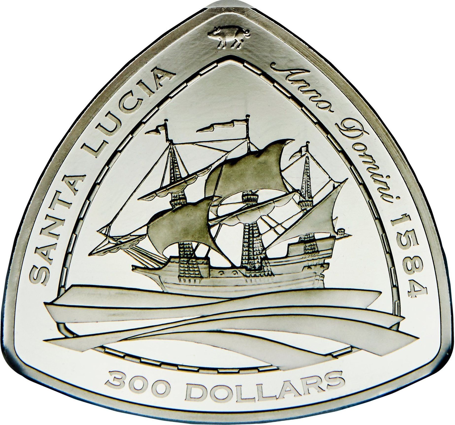 The 300 Dollars coin from Bermuda, issued in 2007, features a striking design that highlights the profile of Queen Elizabeth II, showcasing her regal features with intricate detailing. The coin is shaped like a triangle, which is unique among modern coinage, and is composed of .9995 platinum, weighing 155.52 grams. This high purity and substantial weight contribute significantly to its value, as platinum is a precious metal that commands a premium in the market. The coin's limited mintage and distinctive design elements make it a sought-after piece for collectors, reflecting both historical significance and artistic merit. Its rarity and precious metal content enhance its desirability in numismatic circles.