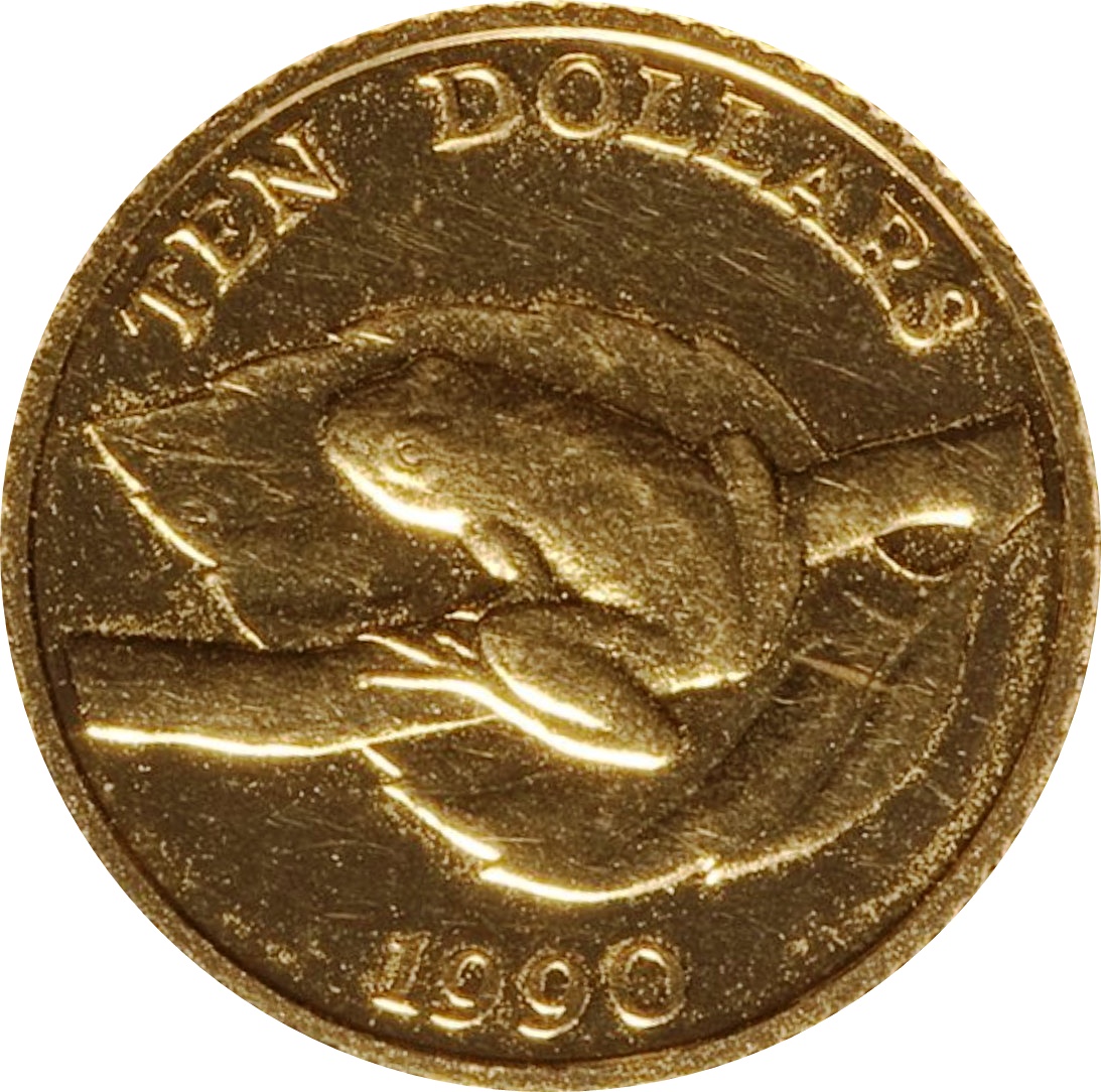 The 10 Dollars coin from Bermuda, issued in 1990, features a striking design that showcases a profile of Queen Elizabeth II, adorned with a crown and elegant jewelry, symbolizing the monarchy's enduring legacy. The reverse side depicts a tree frog, a nod to Bermuda's unique wildlife and natural heritage. This coin is composed of .999 gold, weighing 3.13 grams, which significantly enhances its value due to the intrinsic worth of the precious metal. As a part of a limited mintage, this coin holds historical significance and appeals to collectors for both its artistic design and its representation of Bermuda's culture. Its combination of beauty and precious metal content makes it a sought-after item in numismatic circles.